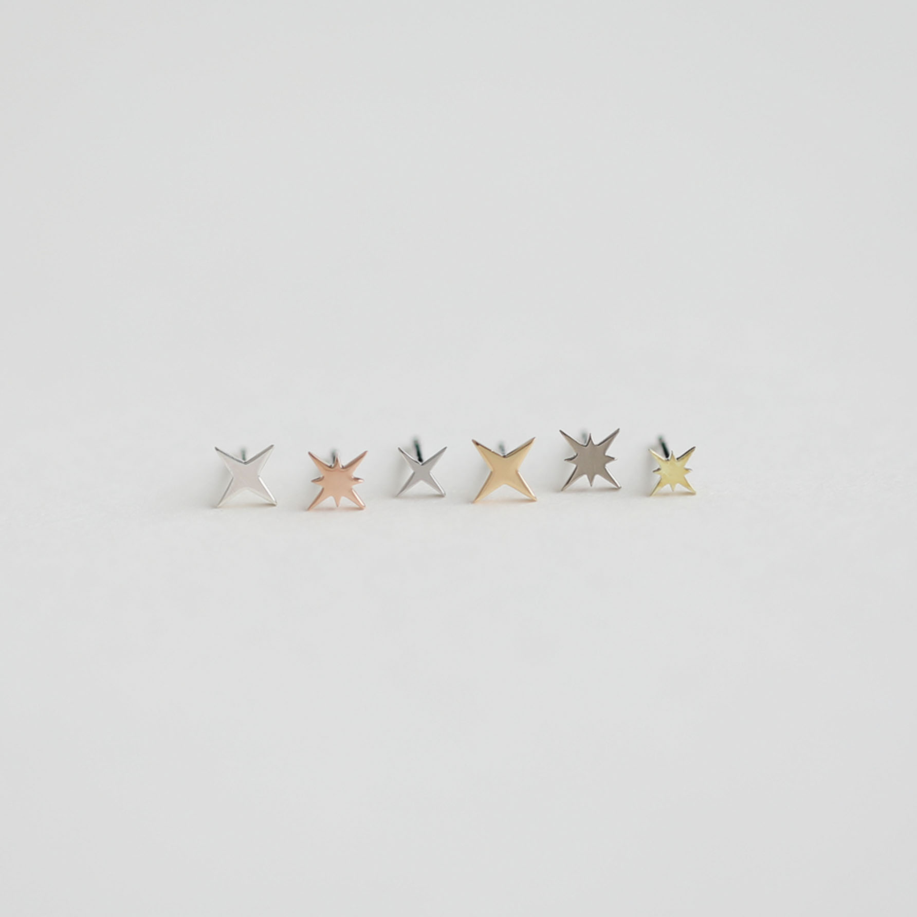 Earrings inspired by stars sparkling in the night sky. To capture stars shining in a variety of colors, a wide range of materials is used, including platinum, yellow gold, pink gold, green gold, and white gold. Though the motifs are small, giving them volume ensures a distinct presence when they catch the light.