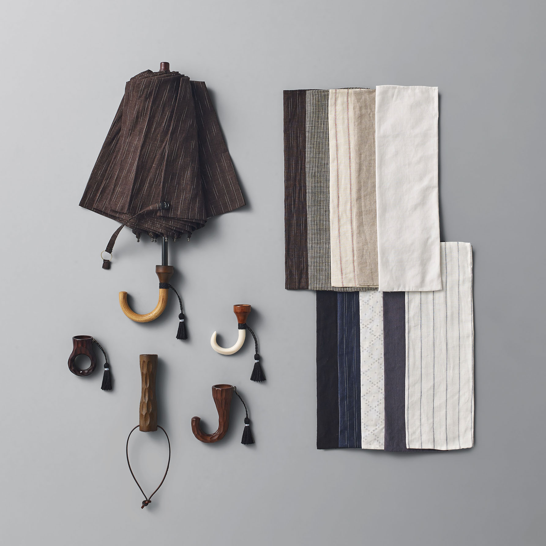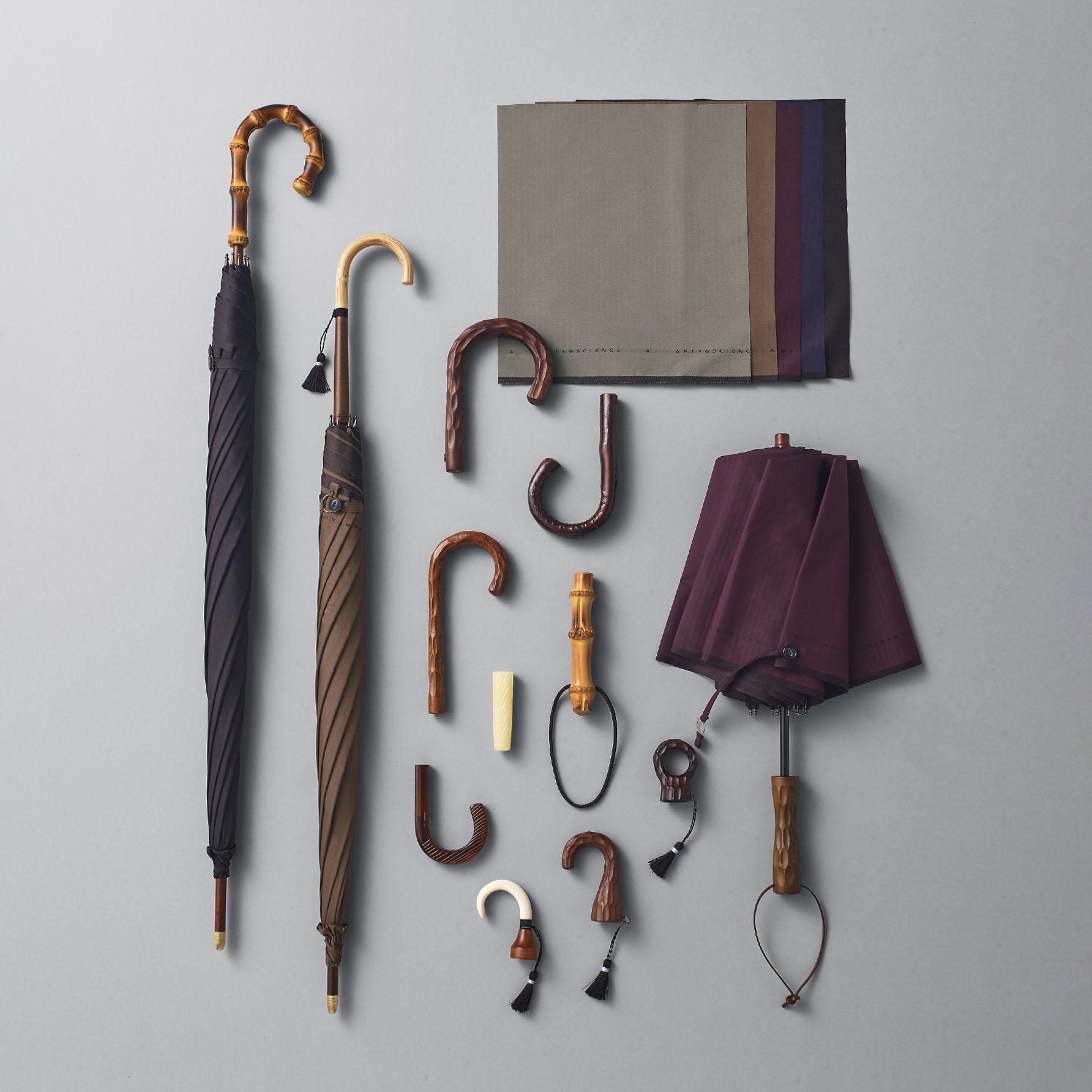 一本ずつ丁寧に仕立てられる、美しく確かな傘づくりで知られるイイダ傘店。A&Sではこれまでも別注アイテムを展開してきましたが、本イベントでは、生地とハンドルの組み合わせを自由に選び、お好みに寄り添う一本を誂えていただけます。