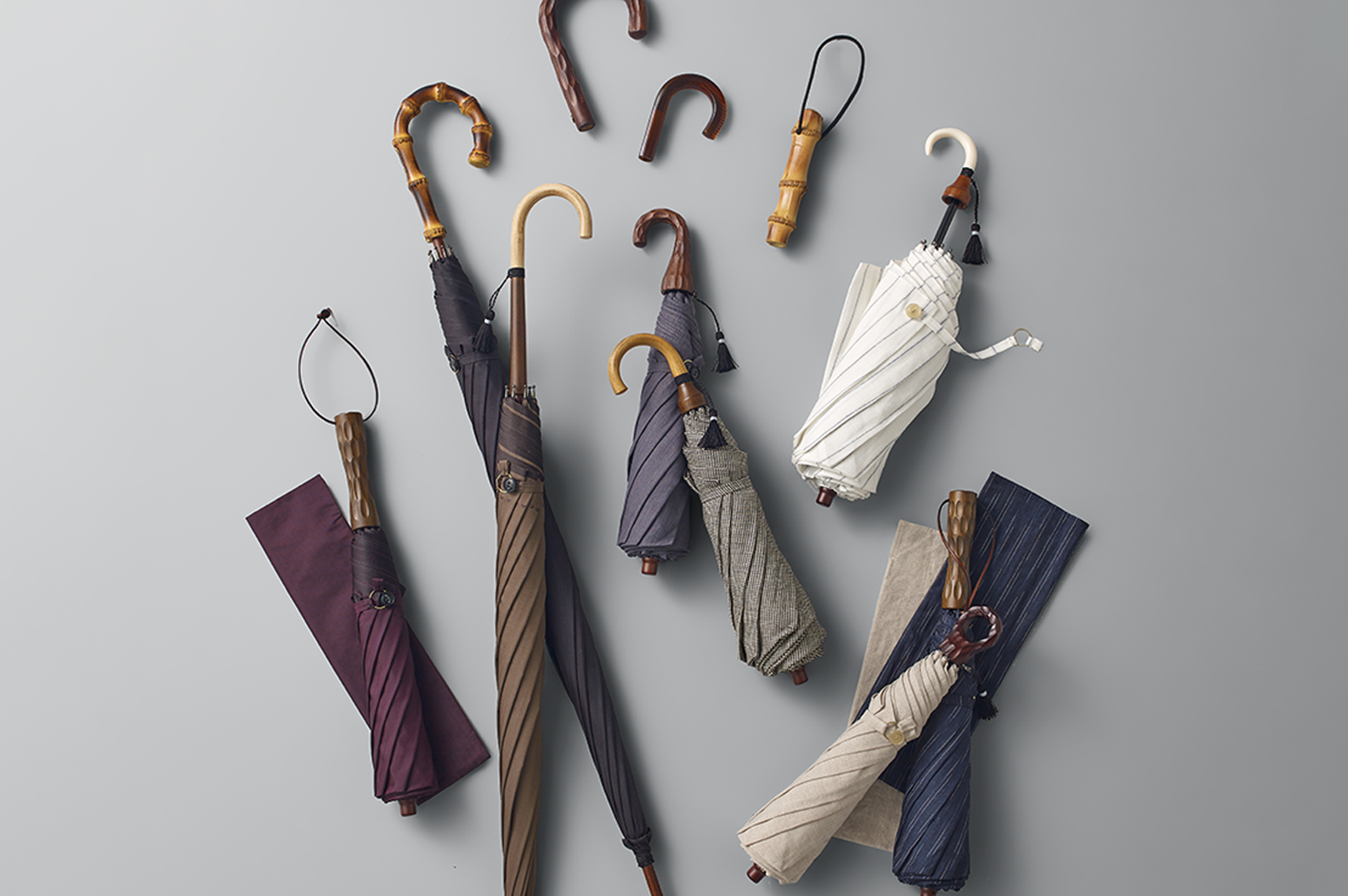 日傘はA&Sオリジナル生地10種とハンドル5種、晴雨兼用傘は別注生地5種とハンドル14種をご用意。いずれも軽量なカーボン製フレームを採用し、日常使いのしやすさにも配慮しています。折り畳み傘は、開閉のスムーズさにこだわった仕様です。