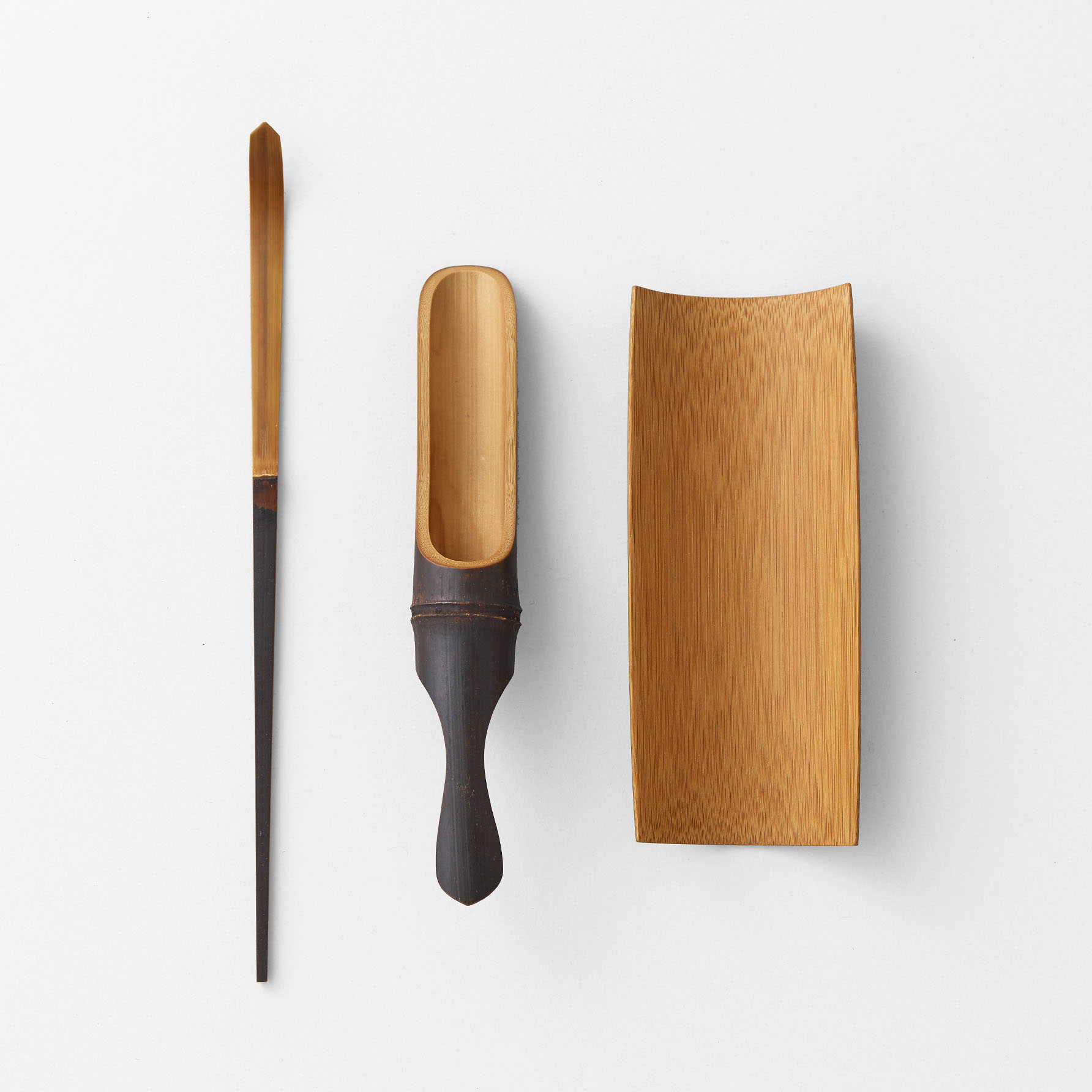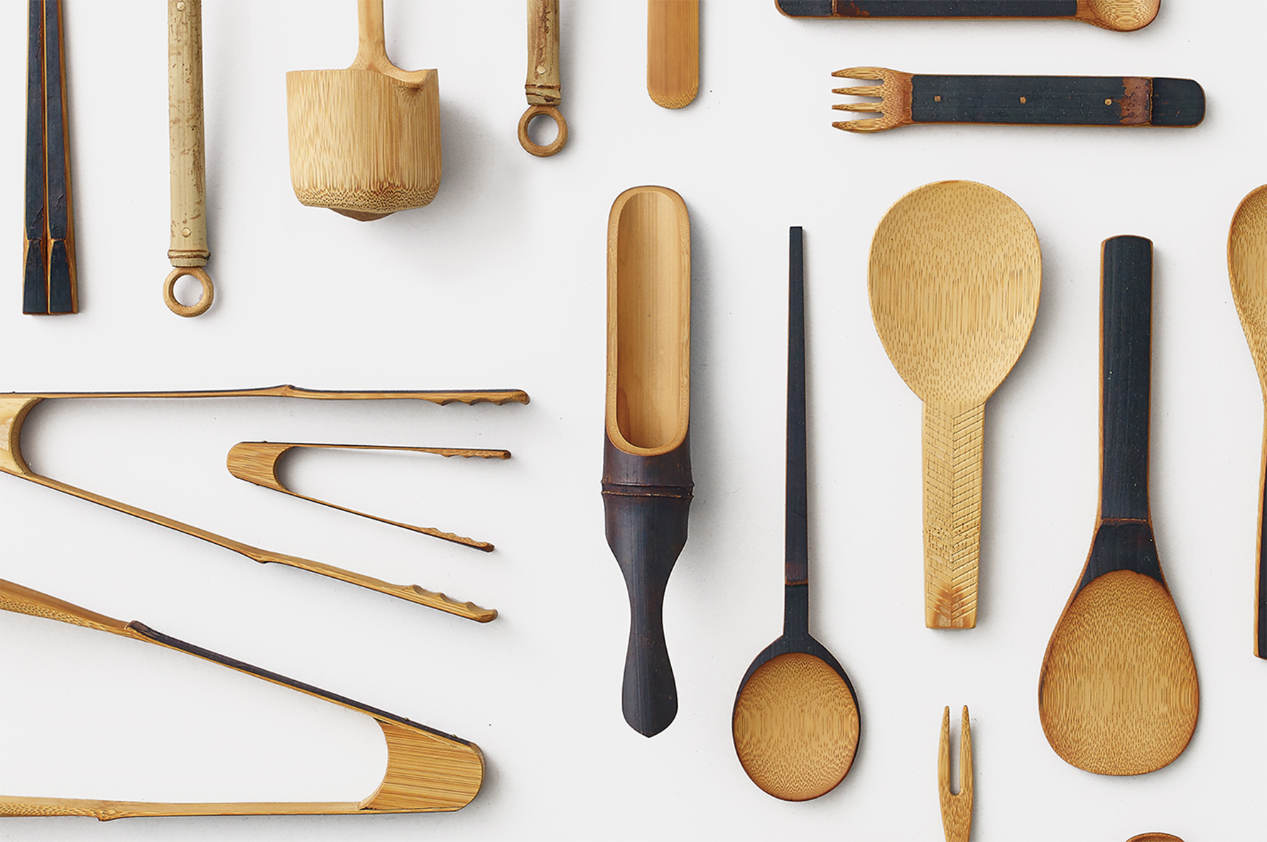 道具づくりの始まりは、炭焼きの合間に、余った竹で箸やスプーンをつくったことでした。身近にあり、直線的で、静かな表情を持つ竹。その素材性に惹かれ、次第に竹そのものと向き合うようになります。やがて、竹は制作の中心となり、暮らしの道具へと姿を変えていきました。