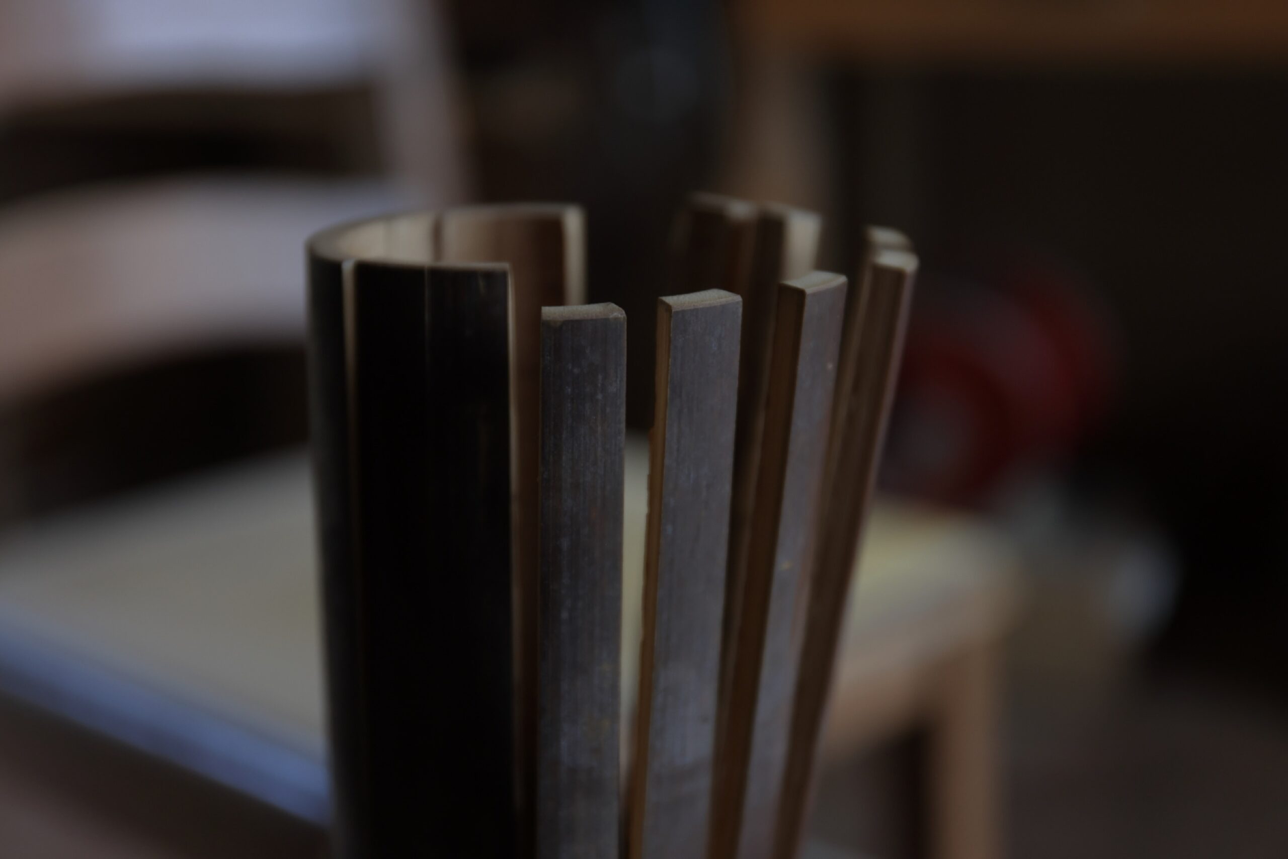 制作は、放置竹林に自生する竹を切り出すところから始まります。切り出した竹は熱処理を施したのち、炭窯でおよそ一週間かけて燻されます。中までしっかり乾燥させることで耐久性が高まり、外側は艶やかな黒へと変化し煤竹へと仕立てられます。