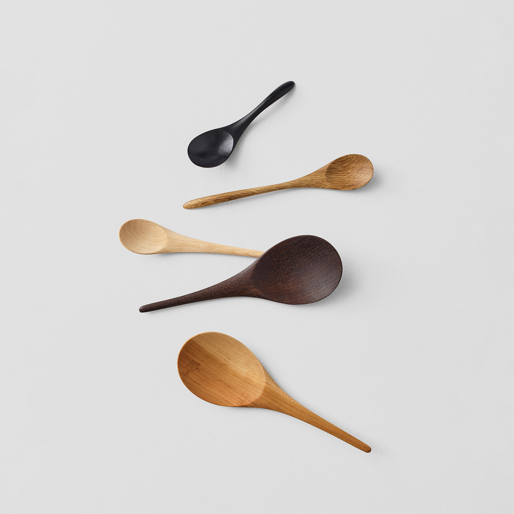 作家がこれまでに製作してきたさまざまな作品に加え、貴重な木材と向き合い新たに製作した定番作品も多く並びます。スプーンやプレート類、ボウルなどのテーブルウェアから、丸太スツールやハンガーまで。基本の形状は同じでも、木という素材の個性によりすべてが一点ものです。